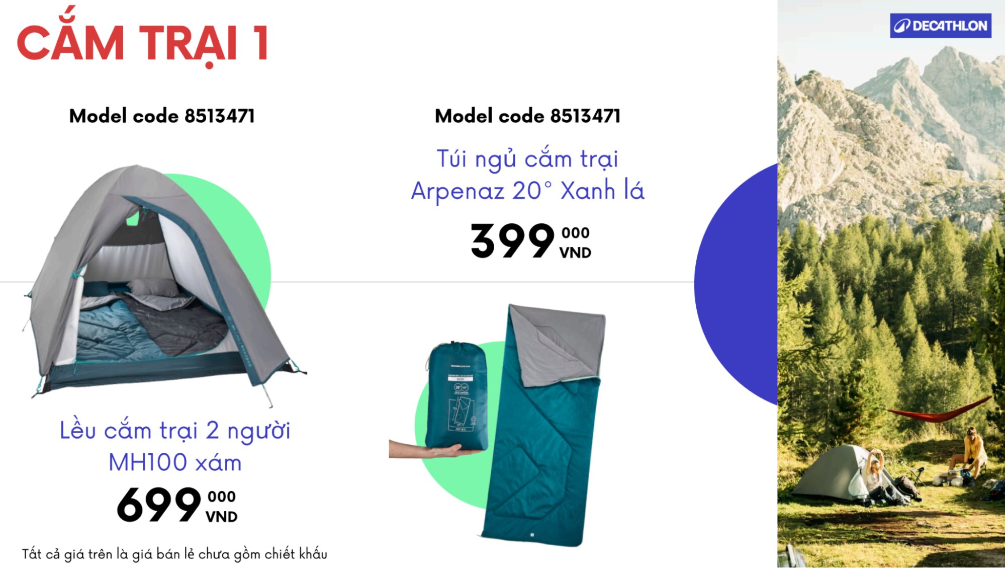 - Túi ngủ cắm trại Arpenaz 20° Xanh lá ~ 399.000 VND: Đảm bảo giấc ngủ ấm áp và thoải mái trong những chuyến dã ngoại. Với thiết kế khóa kéo tiện lợi và chất liệu mềm mại, đây là lựa chọn quà tặng lý tưởng cho các hoạt động team-building hoặc du lịch trải nghiệm.