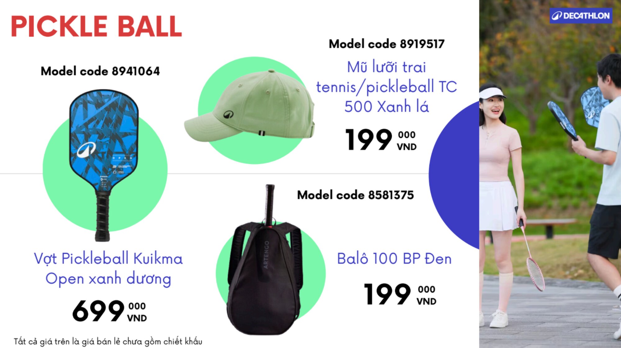 - Mũ lưỡi trai tennis/pickleball TC 500 Xanh lá ~ 199.000 VND: Món phụ kiện tinh tế giúp bảo vệ sức khỏe người dùng trong các hoạt động ngoài trời. Chất liệu vải kỹ thuật siêu nhẹ kết hợp cùng khả năng thấm hút mồ hôi vượt trội mang lại sự thoải mái tối đa dưới nắng gắt. Tông màu xanh trẻ trung không chỉ làm nổi bật bộ nhận diện thương hiệu mà còn lan tỏa năng lượng tích cực, phù hợp làm quà tặng tri ân khách hàng hoặc quà tặng đồng hành trong các chuyến dã ngoại của công ty.