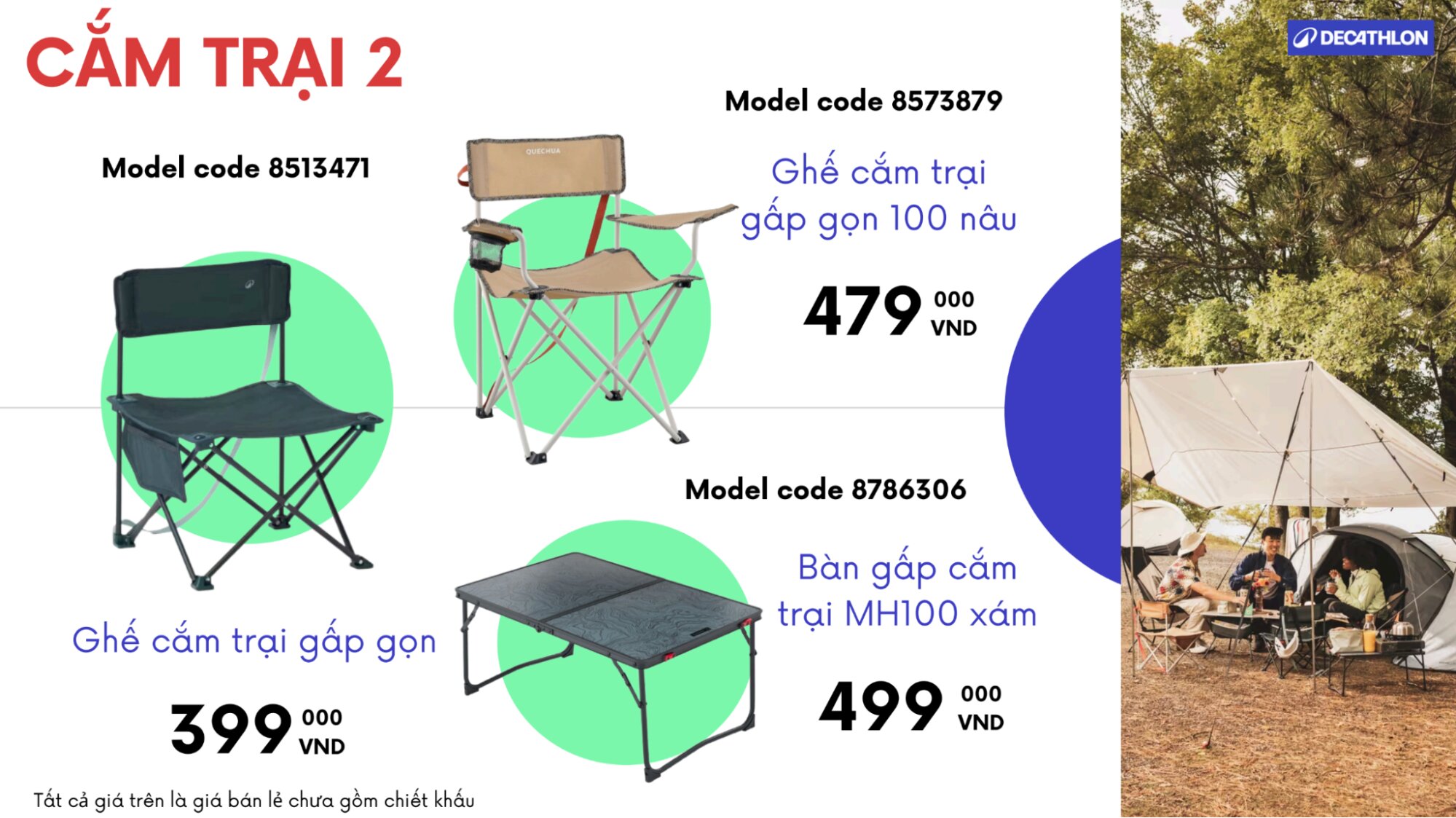 - Ghế cắm trại gấp gọn 100 nâu ~ 479.000 VND: Chiếc ghế nhỏ gọn nhưng vô cùng chắc chắn, mang lại sự thoải mái mọi lúc mọi nơi. Đây là món quà tuyệt vời cho những buổi thư giãn tại công viên, bãi biển hay trong chính khuôn viên sân vườn gia đình.