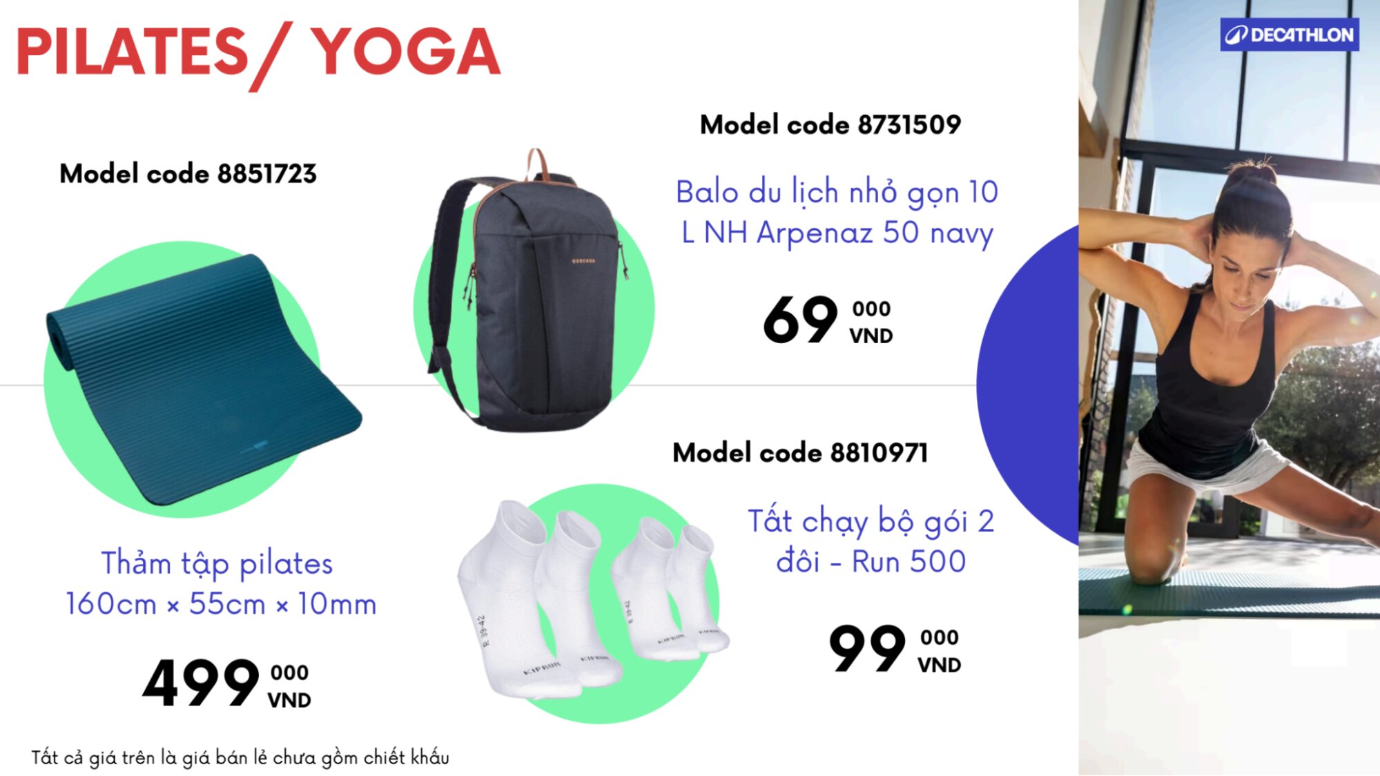 - Running & Fitness: Áo thun công nghệ thoáng khí, thảm Yoga định tuyến, giày chạy bộ siêu nhẹ, mũ lưỡi trai năng động,…