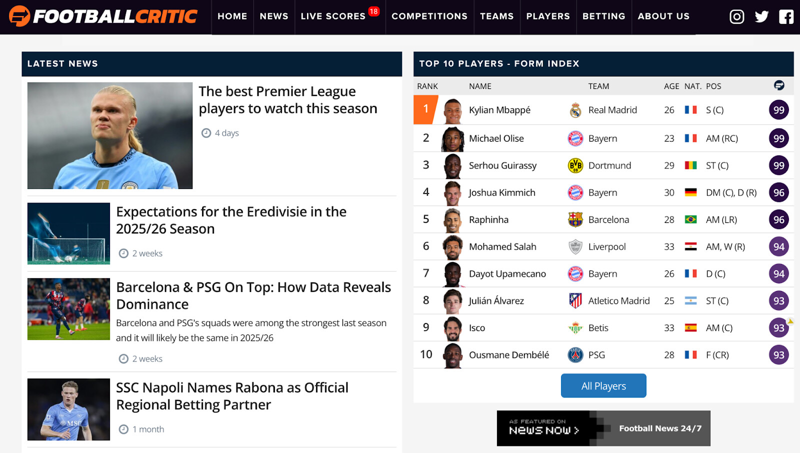 Độ uy tín: FootballCritic được xây dựng dựa trên cơ sở dữ liệu từ Opta – một trong những đơn vị cung cấp thống kê bóng đá hàng đầu thế giới. Trang này tập trung mạnh vào phân tích chuyên sâu, thường được sử dụng bởi giới phân tích và những người nghiên cứu chiến thuật.