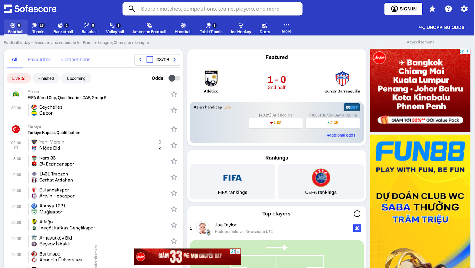 - Cập nhật kết quả trực tiếp, thống kê chi tiết và bảng xếp hạng của hơn 500 giải đấu toàn thế giới.