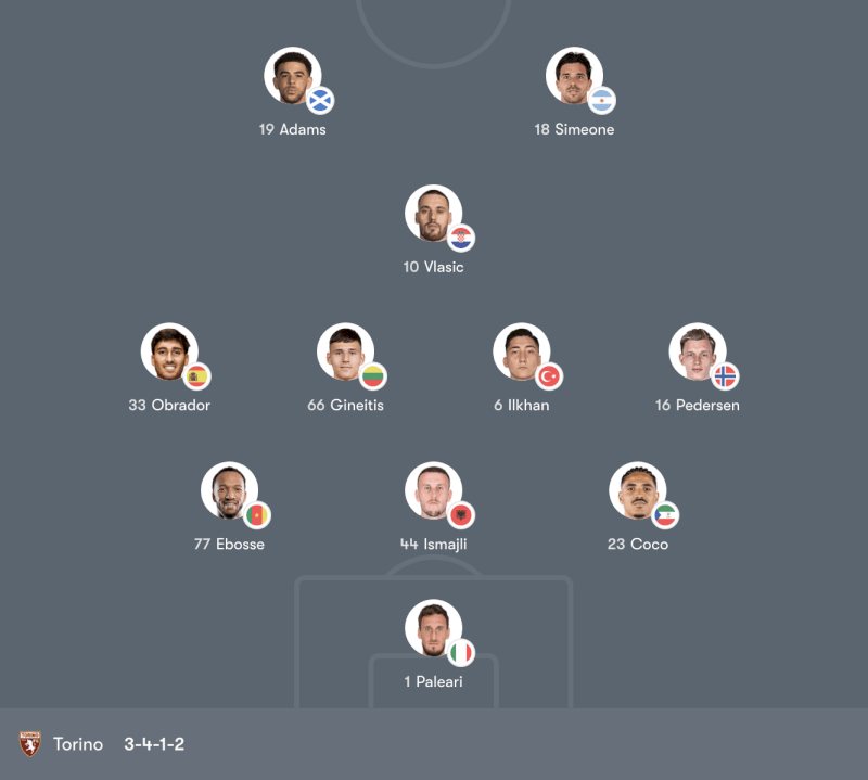 Torino triển khai sơ đồ 3-4-1-2 với sự tập trung vào khả năng phòng ngự và phản công. Bộ ba trung vệ Ebosse, Ismajli và Coco đảm nhiệm vai trò ngăn chặn các pha tấn công trung lộ của Milan.