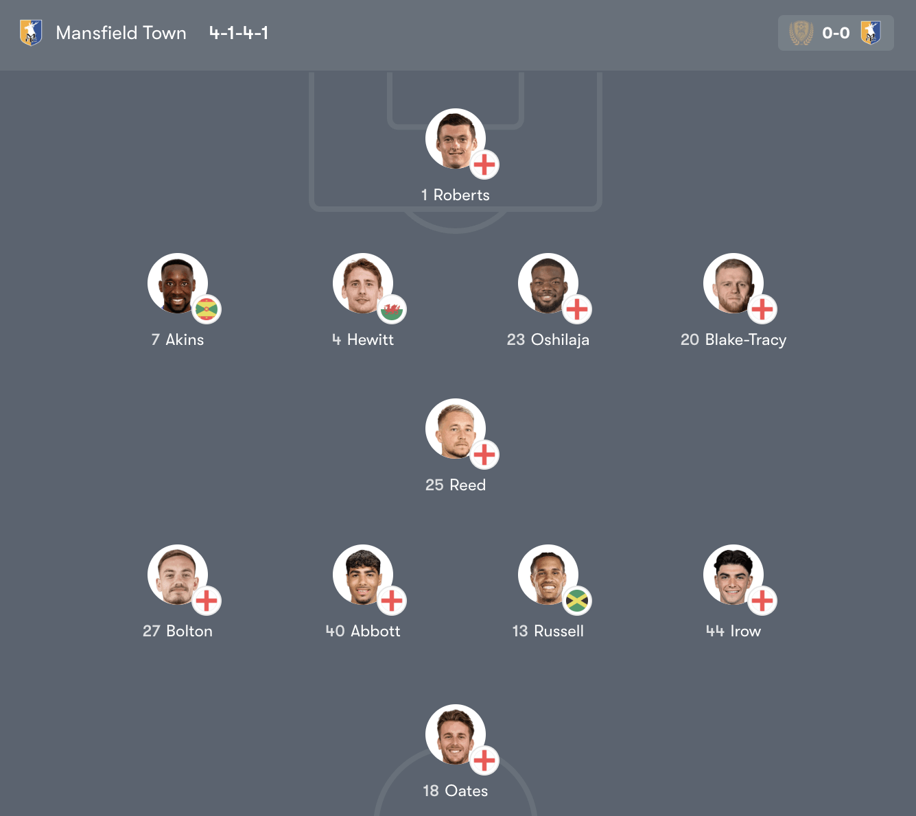 Mansfield Town lựa chọn cấu trúc đội hình thiên về phòng ngự, ưu tiên sự chặt chẽ và các tình huống phản công tốc độ.