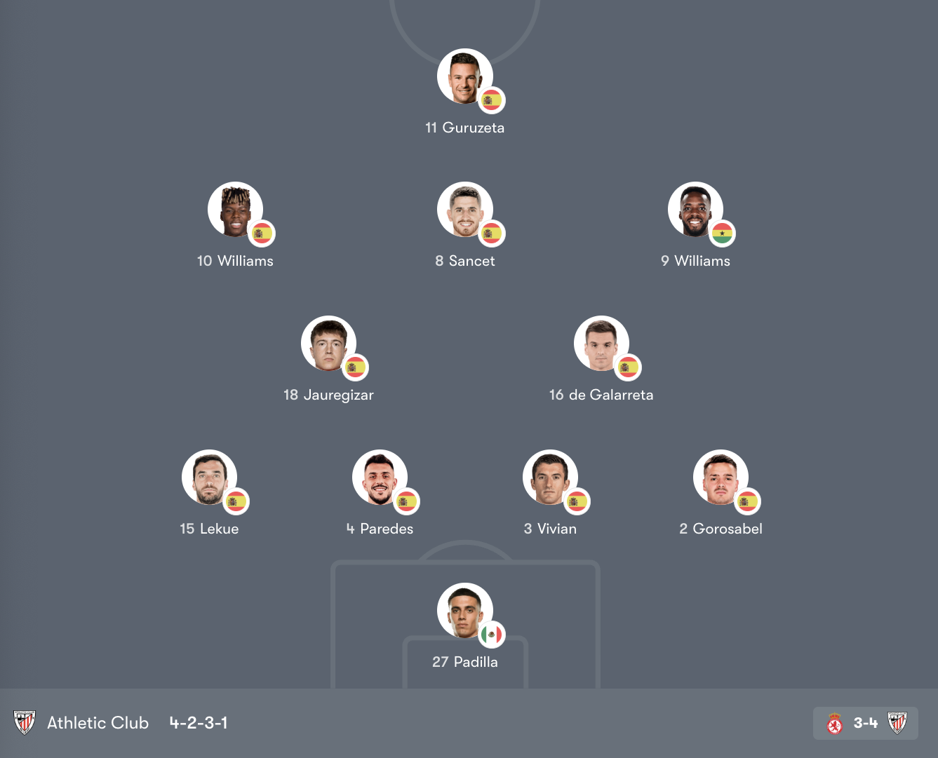 Ở tuyến giữa, De Galarreta giữ nhiệm vụ điều tiết lối chơi, trong khi Jauregizar hỗ trợ tranh chấp và thu hồi bóng. Phía trên, Sancet đóng vai trò trung tâm sáng tạo, kết nối với hai anh em nhà Williams. Nico Williams mang đến tốc độ và khả năng đi bóng bên cánh trái, còn Iñaki Williams thường xuyên xâm nhập trung lộ để tạo áp lực lên hàng thủ đối phương. Guruzeta là mũi nhọn cao nhất, đảm nhiệm vai trò dứt điểm và làm tường trong vòng cấm.