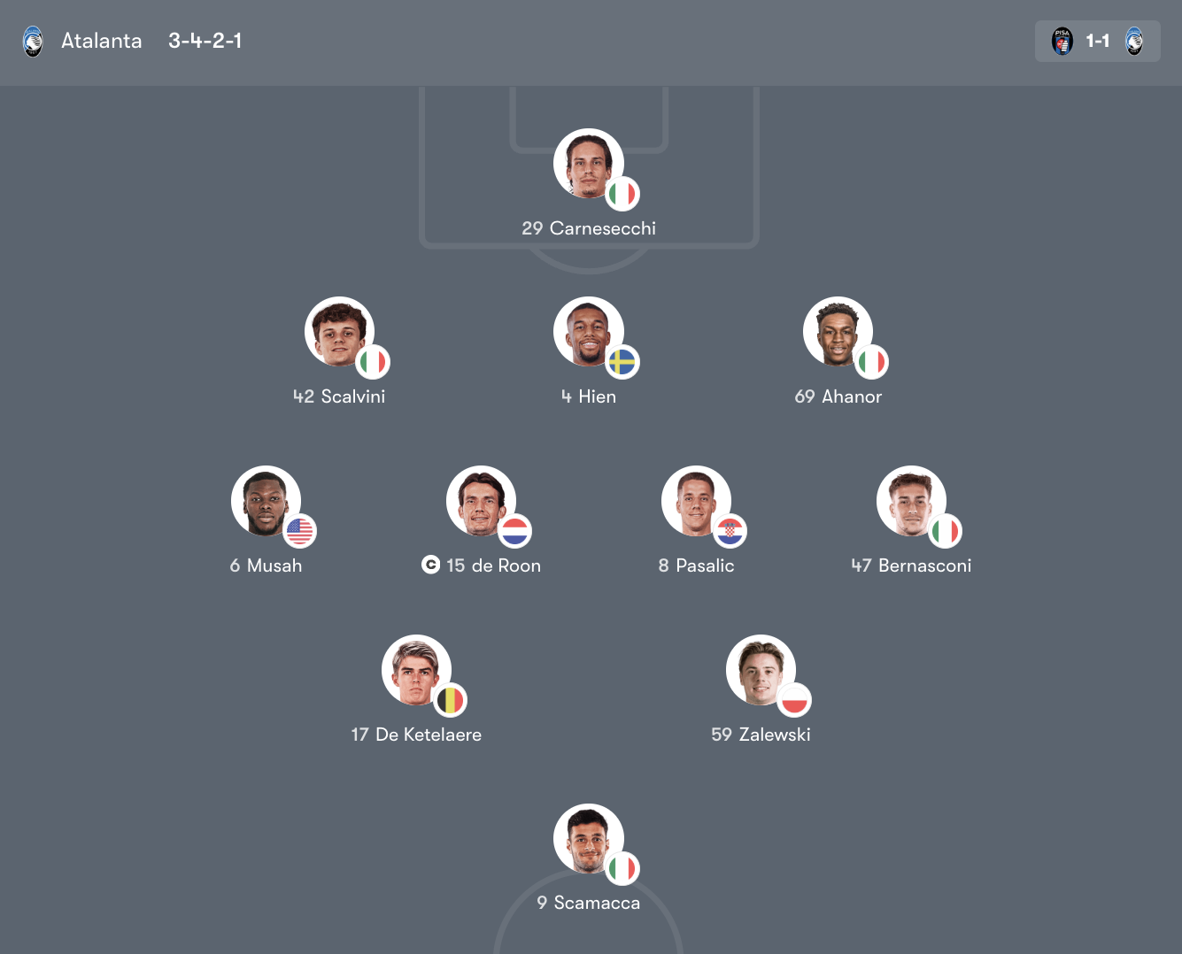 Tiền vệ: Musah (6) – De Roon (15, Đội trưởng) – Pasalic (8) – Bernasconi (47)