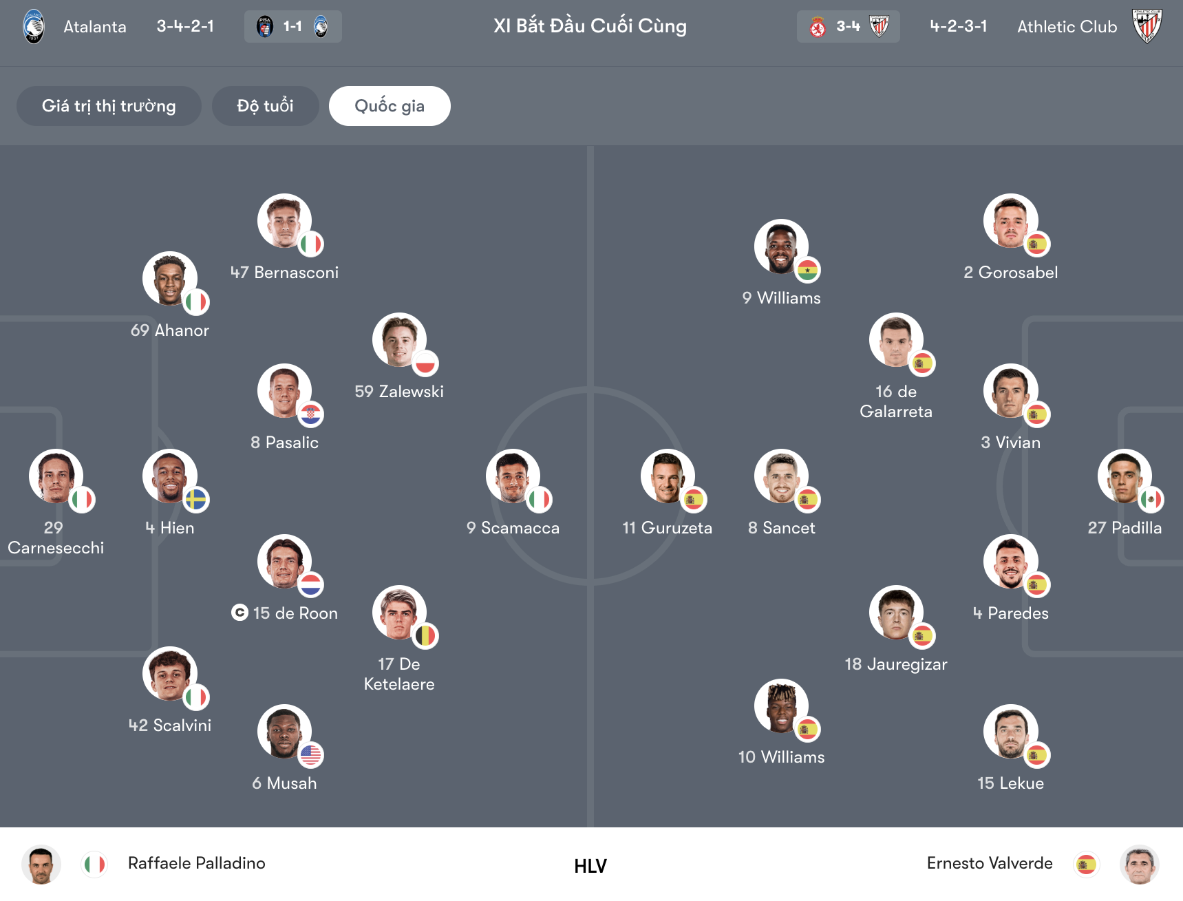 Athletic Club sở hữu tuyến giữa giàu năng lượng, sẵn sàng pressing liên tục. Atalanta lại nổi bật ở khả năng kiểm soát không gian và chuyển trạng thái nhanh, với De Roon là trung tâm điều phối.