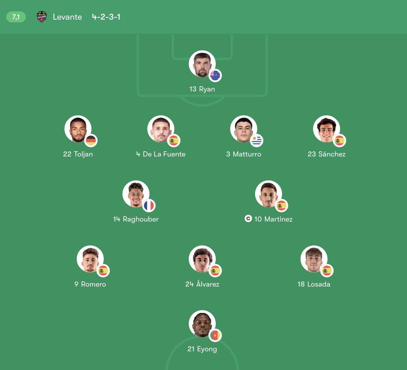 Phân tích Levante: Levante được dự đoán ra sân với sơ đồ 4-2-3-1, ưu tiên sự chắc chắn nơi tuyến giữa và khả năng phòng ngự có tổ chức. Kinh nghiệm của Mathew Ryan trong khung gỗ là chốt chặn quan trọng, giúp Levante duy trì sự ổn định trước sức ép từ hàng công Atlético.