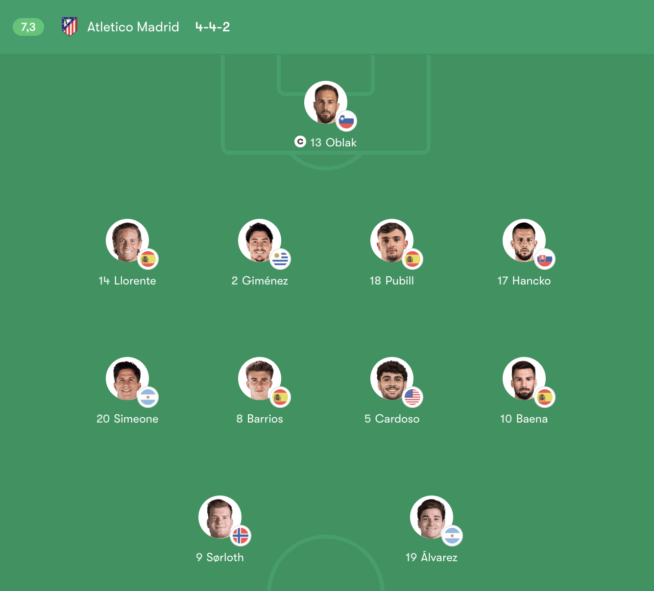 Hàng tiền vệ: Giuliano Simeone (20, cánh phải) – Pablo Barrios (8, tiền vệ trung tâm) – Johnny Cardoso (5, tiền vệ trung tâm) – Álex Baena (10, cánh trái)