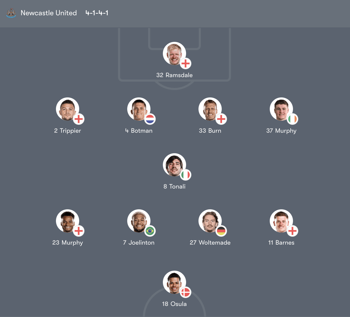 Tiền vệ tấn công: Murphy (23) – Joelinton (7) – Woltemade (27) – Barnes (11)