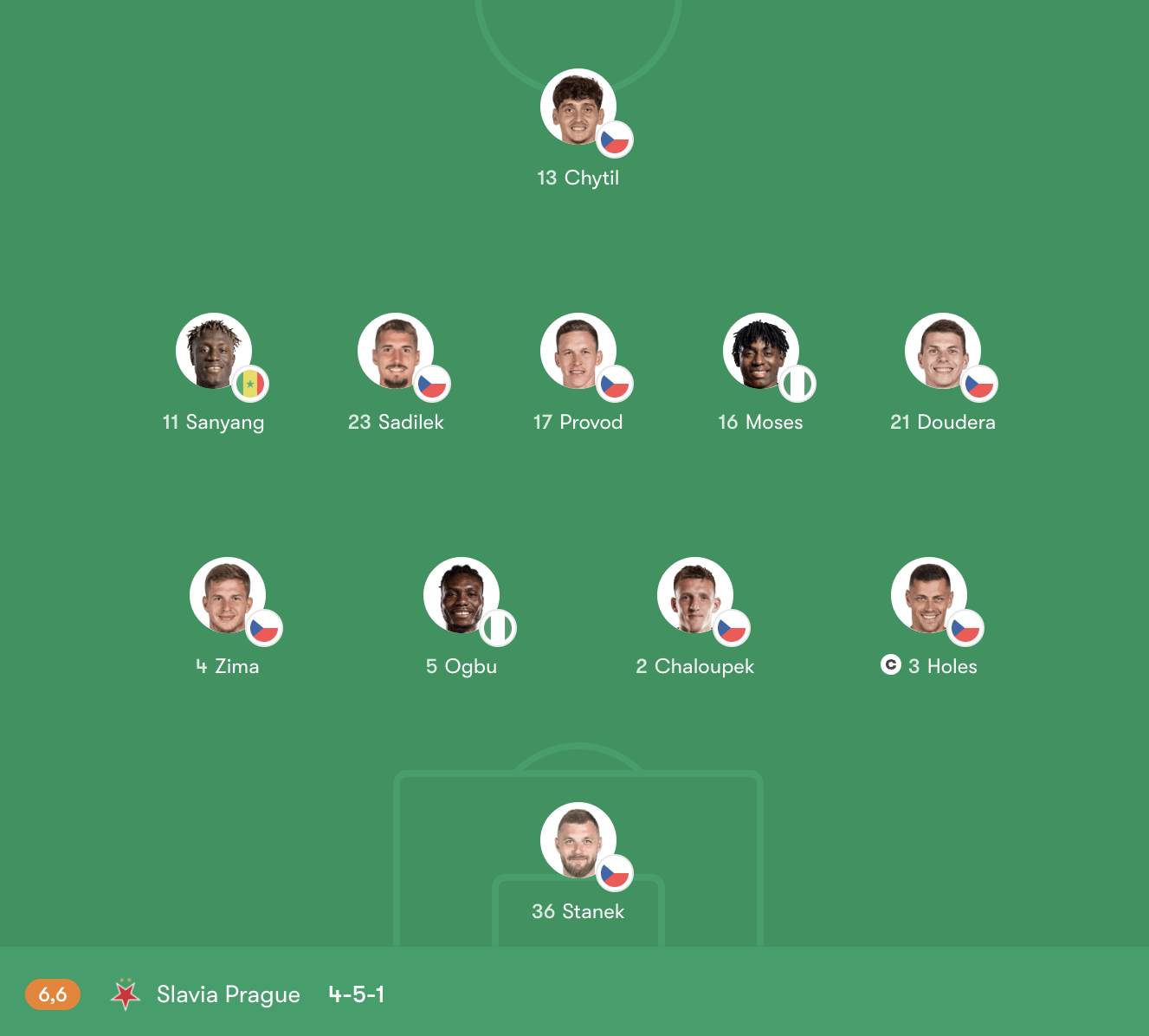 Tình hình lực lượng Slavia Praha: Slavia Praha tiếp cận trận đấu với sơ đồ 4-5-1 thiên về phòng ngự số đông, tập trung bảo vệ khu vực trung lộ và hạn chế khoảng trống trước vòng cấm. Bộ đôi trung vệ Ogbu và Chaloupek giữ vai trò then chốt trong các tình huống tranh chấp, trong khi hai hậu vệ biên ưu tiên bọc lót thay vì dâng cao.