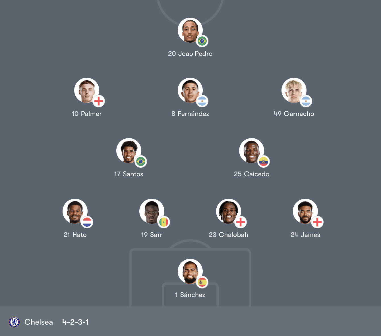 Ở hai biên, James và Hato mang đến khả năng dâng cao, tạo chiều rộng để đội hình Chelsea kéo giãn khối phòng ngự đối phương. Bộ ba Garnacho – Fernández – Palmer đóng góp lớn vào tính đột biến: Garnacho khai thác tốc độ, Palmer giữ vai trò sáng tạo, còn Fernández kết nối các tuyến và khai thác khoảng trống ở hành lang trong.