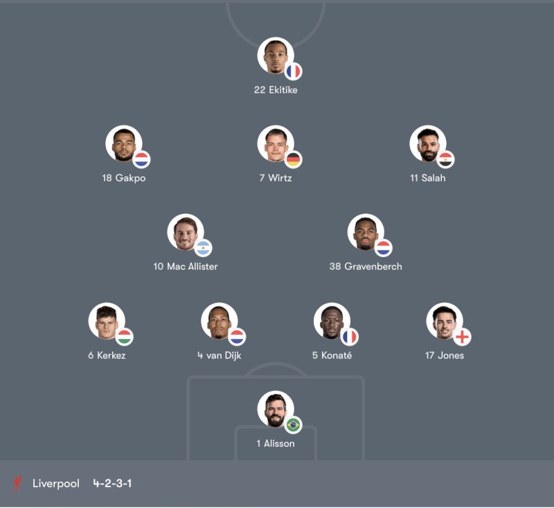 Liverpool vận hành hệ thống 4-2-3-1 nhằm duy trì khả năng kiểm soát bóng và tạo chiều sâu tấn công. Bộ đôi Van Dijk – Konaté đóng vai trò trụ cột trong việc giữ cự ly đội hình và hỗ trợ phát triển bóng từ phần sân nhà. Kerkez và Jones hoạt động dâng cao thường xuyên, mở ra các tình huống chồng biên cho Gakpo và Salah.