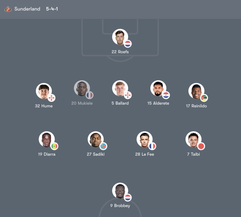 Sunderland thiết lập khối phòng ngự 5-4-1 với mục tiêu giữ chặt trung lộ và hạn chế khoảng trống dành cho các mũi tấn công tốc độ của Liverpool. Bộ ba trung vệ Ballard – Alderete – Mukiele là nền tảng giúp đội chủ nhà tăng cường khả năng bọc lót, đặc biệt trong những tình huống tranh chấp trên không hoặc bóng dài.