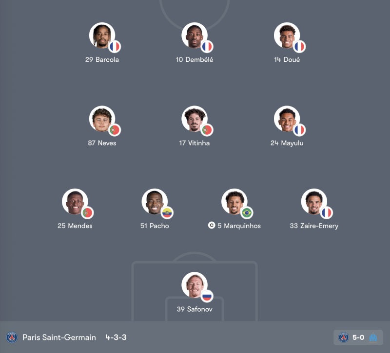 PSG sử dụng sơ đồ 4-3-3 với mục tiêu duy trì sự linh hoạt trong việc kiểm soát không gian và tăng cường khả năng luân chuyển bóng giữa các tuyến. Bộ đôi trung vệ Pacho – Marquinhos tạo sự vững chắc trong các tình huống đối mặt trực diện, trong khi Mendes và Zaïre-Emery cung cấp chiều rộng và yếu tố tốc độ ở hai hành lang biên.