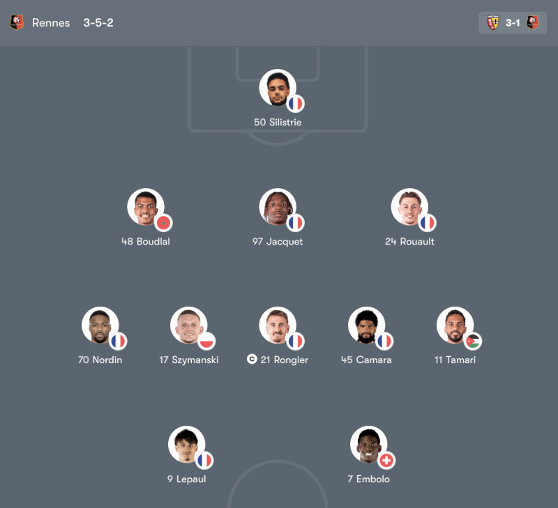 Tuyến giữa với Rongier – Szymański – Camara mang đến sự cân bằng giữa pressing, điều tiết lối chơi và thu hồi bóng. Ở phía trên, bộ đôi Lepaul – Embolo tập trung vào các pha chạy chỗ khai thác lưng hàng thủ PSG, đặc biệt trong những tình huống chuyển trạng thái.