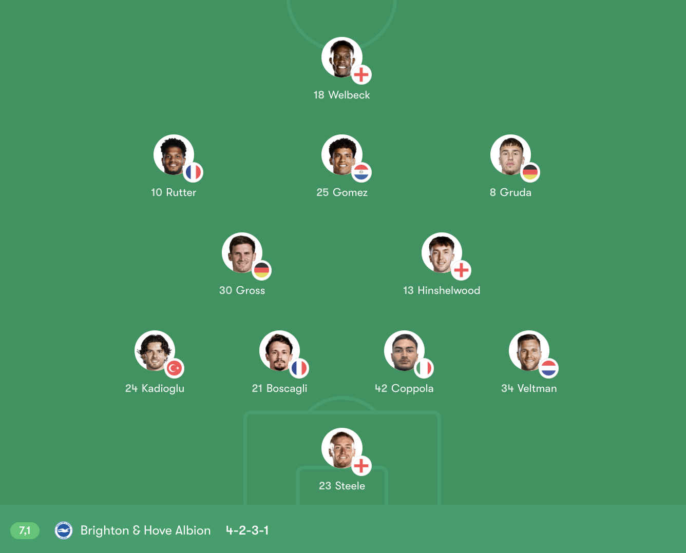 Ở hai biên, Kadioglu và Veltman đảm bảo sự cân bằng giữa tấn công và phòng ngự. Trên hàng công, Rutter và Gruda mang đến sự cơ động, thường xuyên bó vào trong để tạo khoảng trống cho các pha xâm nhập trung lộ. Welbeck đá cao nhất, tận dụng kinh nghiệm và khả năng chọn vị trí để gây áp lực lên hàng thủ Fulham.