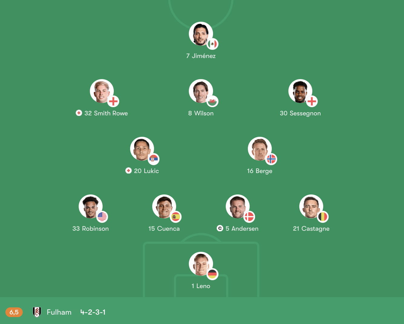 Ở tuyến giữa, bộ đôi Lukić – Berge mang đến sự chắc chắn trong tranh chấp và khả năng che chắn từ xa. Trên hàng công, Smith Rowe và Sessegnon giúp Fulham duy trì tốc độ ở hai biên, trong khi Harry Wilson đóng vai trò kết nối lối chơi và tung ra những đường chuyền quyết định. Jiménez là mũi nhọn cao nhất, với kinh nghiệm và khả năng làm tường trong vòng cấm.