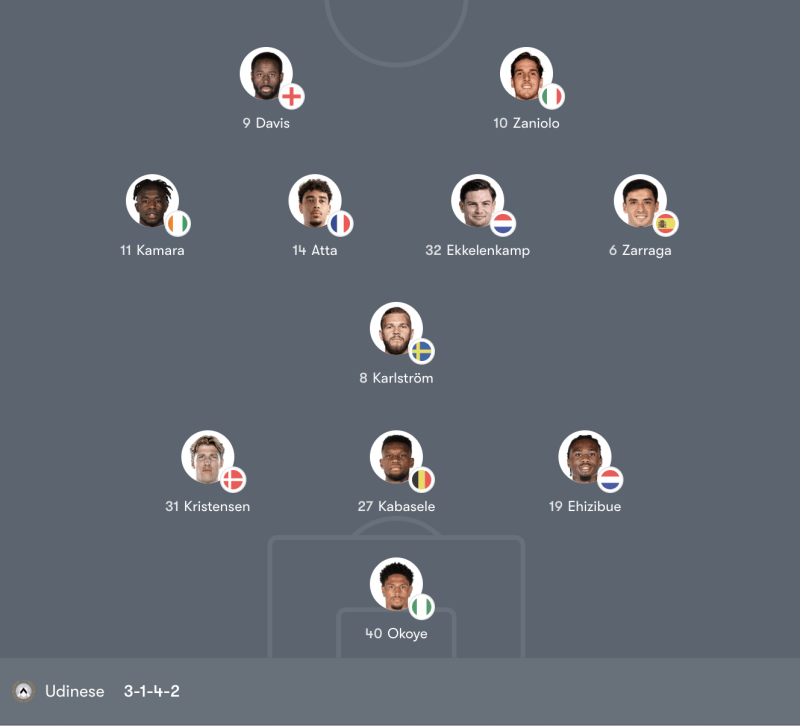 Ở phía trên, hàng tiền vệ 4 người với Kamara và Zarraga hoạt động rộng hai biên, trong khi Atta và Ekkelenkamp đảm nhiệm vai trò kết nối và tổ chức tấn công. Trên hàng công, Davis và Zaniolo mang đến sự kết hợp giữa sức mạnh và kỹ thuật, sẵn sàng khai thác khoảng trống phía sau hàng thủ đối phương.