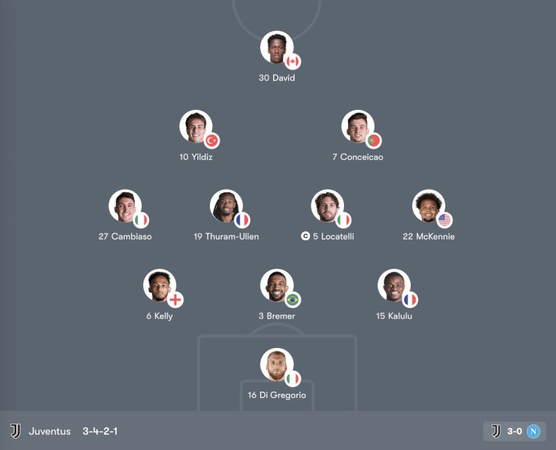 Ở tuyến giữa, Locatelli là nhân tố giữ nhịp, điều tiết lối chơi và tổ chức triển khai bóng từ tuyến dưới. Thuram-Ulién và McKennie mang đến năng lượng, khả năng tranh chấp và hỗ trợ cả hai biên, trong khi Cambiaso thường xuyên dâng cao bên cánh trái để tạo chiều rộng. Trên hàng công, Yildiz và Conceição hoạt động giữa các tuyến, đóng vai trò kết nối và tạo đột biến, hỗ trợ David – trung phong cắm có khả năng làm tường và dứt điểm trong vòng cấm.