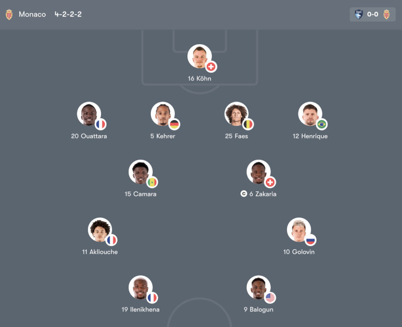 Tình hình lực lượng Monaco: Monaco triển khai sơ đồ 4-2-2-2 với mục tiêu duy trì sự cân bằng giữa phòng ngự và khả năng phản công nhanh. Cặp trung vệ Kehrer – Faes mang lại sự chắc chắn và kinh nghiệm, trong khi hai hậu vệ biên Ouattara và Henrique sẵn sàng dâng cao để hỗ trợ tấn công khi có cơ hội.