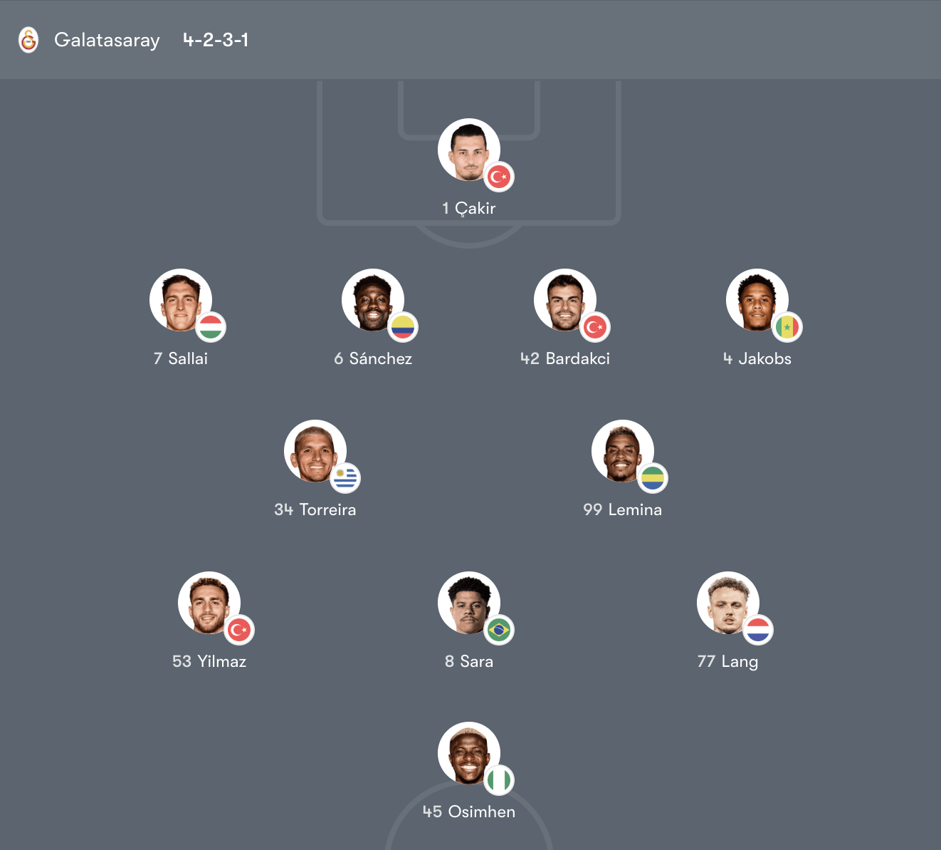 Galatasaray lựa chọn cấu trúc đội hình thiên về sự cân bằng giữa phòng ngự và phản công nhanh. Bộ đôi Lemina – Torreira đóng vai trò kiểm soát khu trung tuyến, đảm nhiệm thu hồi bóng và phân phối lên phía trên. Hai biên Lang và Yilmaz thường xuyên mở rộng không gian, tạo điều kiện cho các pha tấn công biên hoặc căng ngang vào vòng cấm. Trên hàng công, Osimhen là mũi nhọn chính với khả năng bứt tốc và dứt điểm đa dạng. Hàng thủ do Bardakci và Sánchez chỉ huy cần duy trì sự kỷ luật để đối phó với sức ép liên tục từ Liverpool.