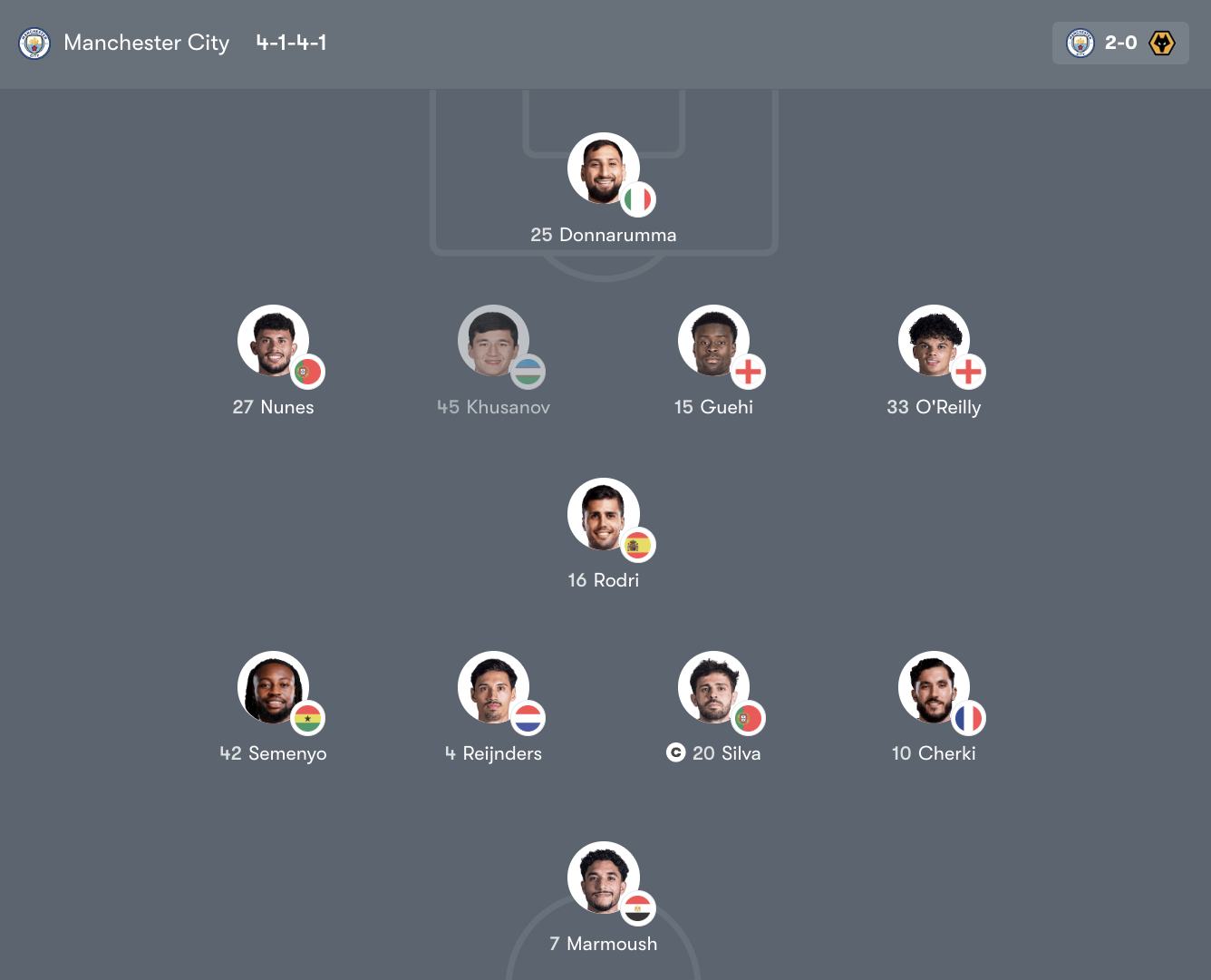 Tiền vệ tấn công: Antoine Semenyo (42) – Tijjani Reijnders (4) – Bernardo Silva (20) – Rayan Cherki (10)