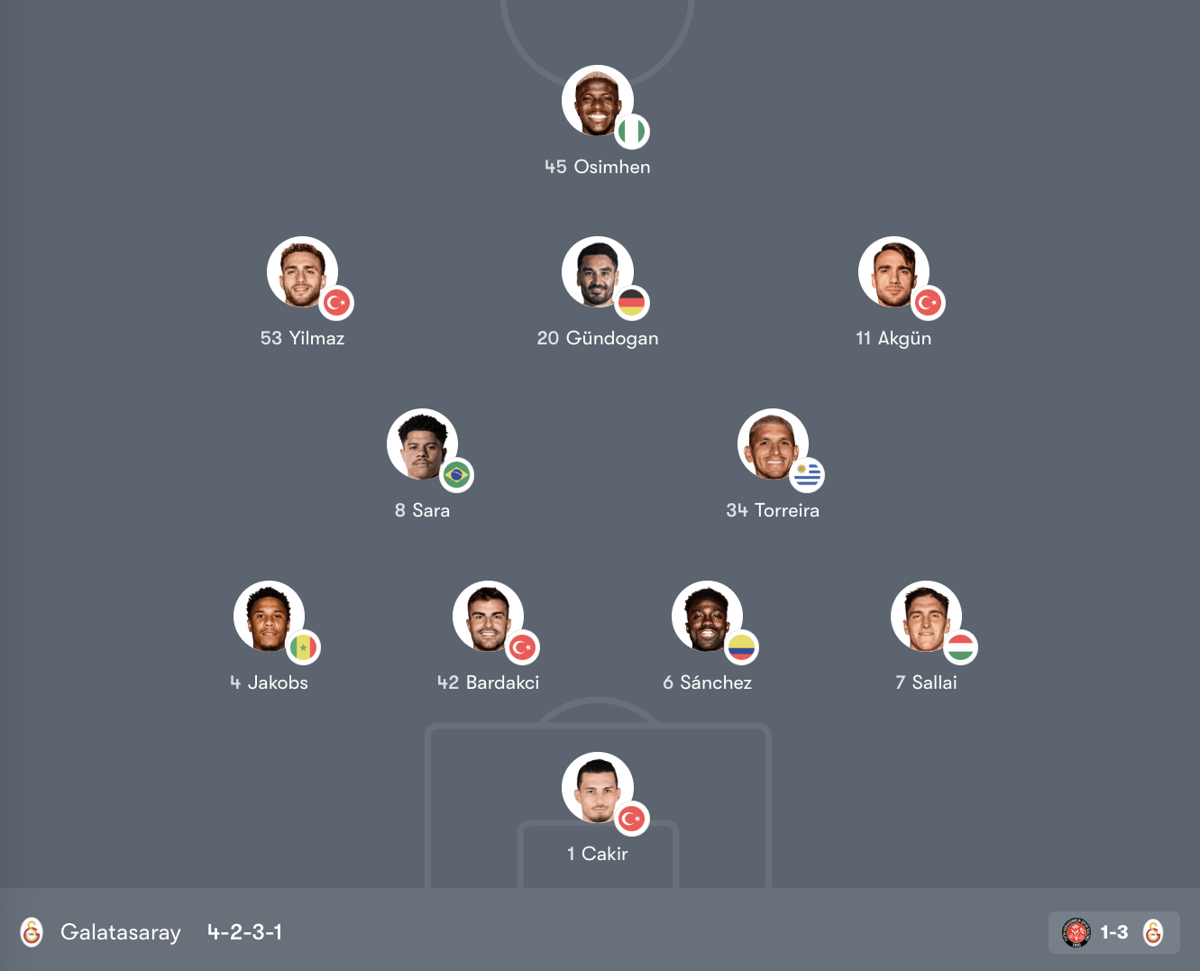 Ở tuyến trên, İlkay Gündoğan đóng vai trò tổ chức lối chơi, tận dụng kinh nghiệm và khả năng chuyền bóng để điều phối các pha lên bóng. Hai cánh với Barış Alper Yılmaz và Yunus Akgün là hướng phản công chủ đạo, hỗ trợ Victor Osimhen – mũi nhọn nguy hiểm nhất với khả năng tì đè, di chuyển không bóng và dứt điểm trong vòng cấm.