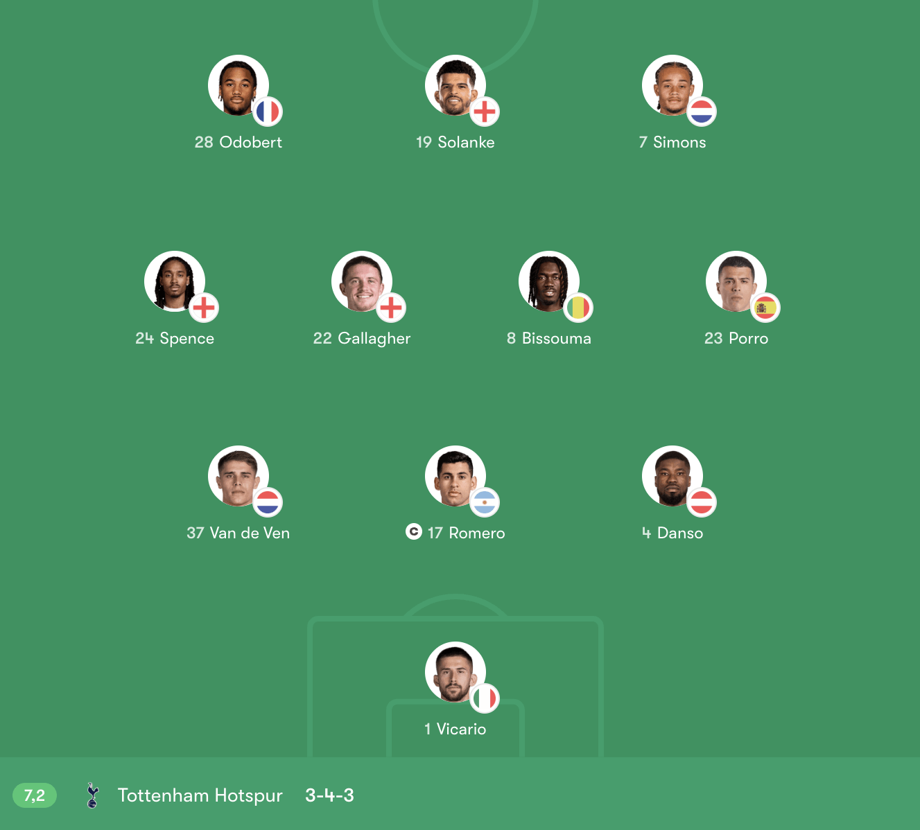 Ở tuyến giữa, Bissouma giữ vai trò thu hồi bóng và đánh chặn, trong khi Gallagher hỗ trợ pressing và di chuyển không bóng. Porro và Spence hoạt động như hai wing-back, đảm nhiệm vai trò tạo chiều rộng và hỗ trợ tấn công biên. Trên hàng công, Solanke đá trung phong, làm tường và thu hút hậu vệ, tạo khoảng trống cho Simons và Odobert khai thác bằng tốc độ và kỹ thuật.