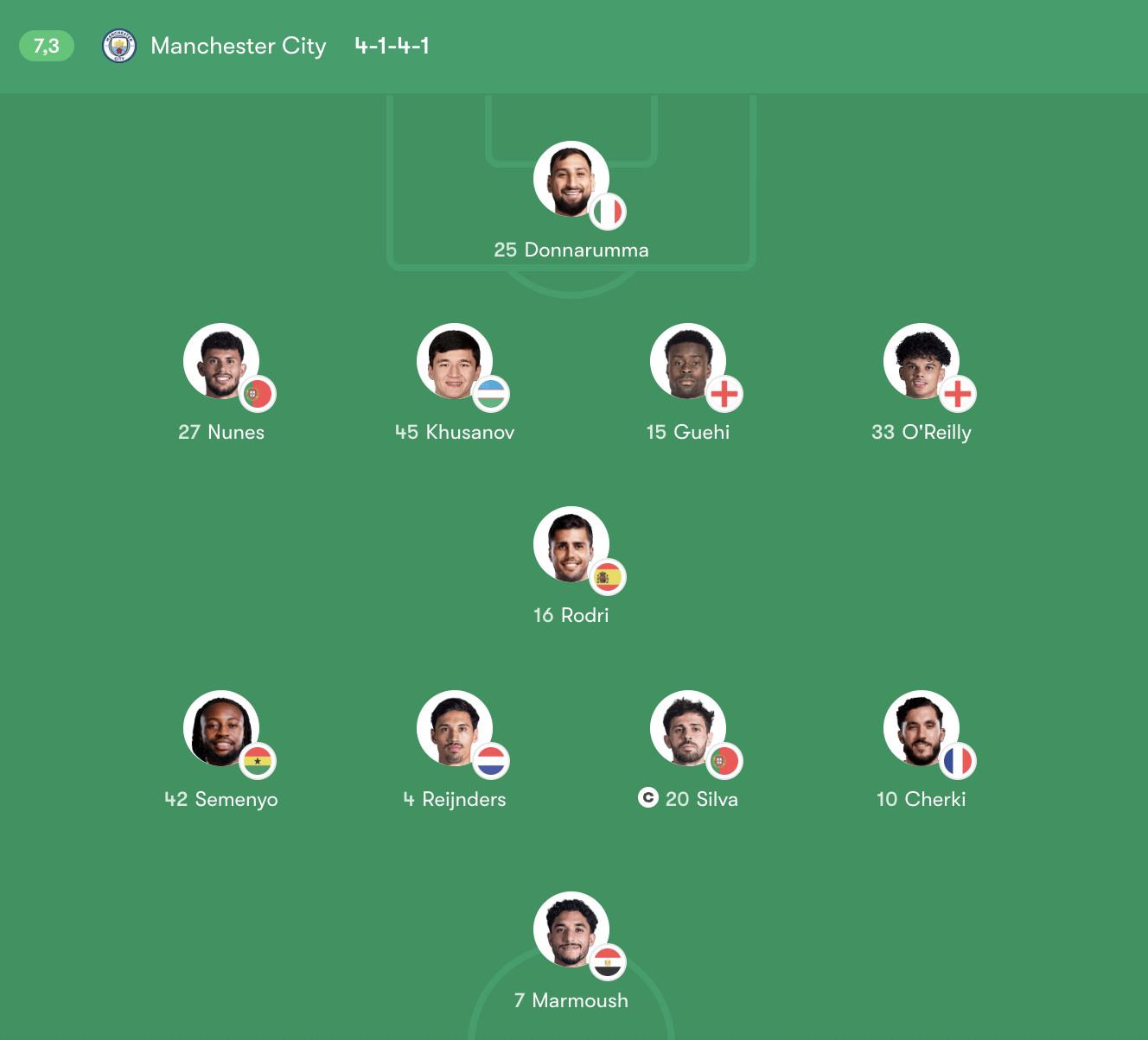 Tiền vệ tấn công: Rayan Cherki (10) – Bernardo Silva (20, Đội trưởng) – Tijjani Reijnders (4) – Antoine Semenyo (42)