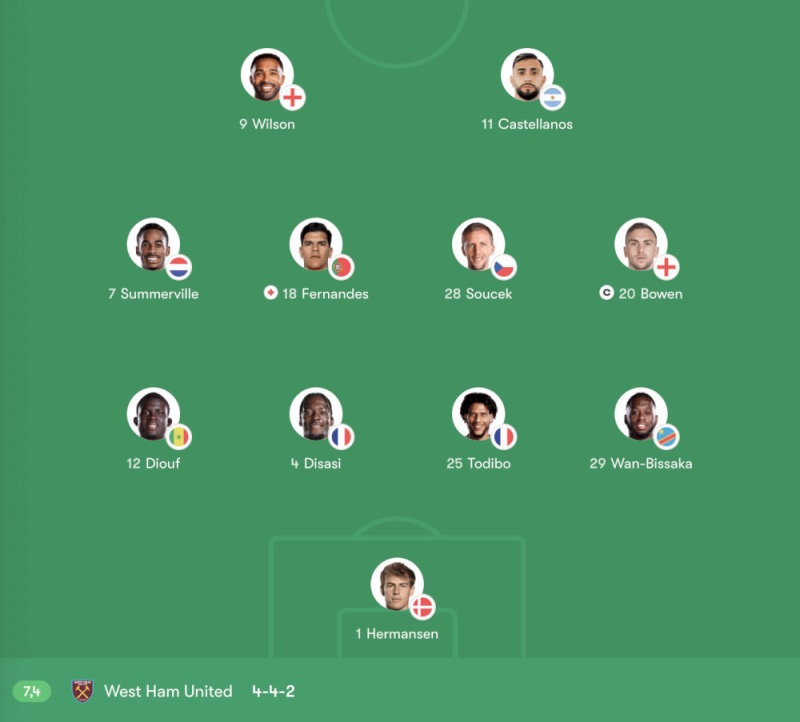 Ở tuyến giữa, Soucek và Fernandes đóng vai trò tranh chấp và thu hồi bóng, tạo nền tảng cho các pha chuyển trạng thái nhanh. Hai cánh Summerville và Bowen có nhiệm vụ mở rộng không gian tấn công, đồng thời hỗ trợ đưa bóng vào vòng cấm.