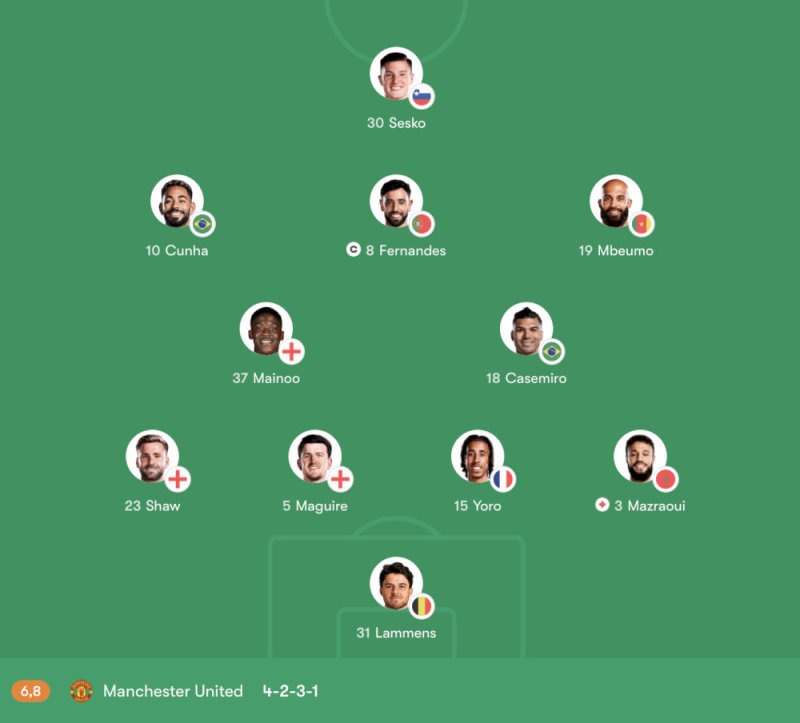 Ở tuyến giữa, Casemiro giữ nhiệm vụ đánh chặn và cân bằng cấu trúc phòng ngự, còn Mainoo đảm nhận vai trò hỗ trợ luân chuyển bóng và kết nối các tuyến. Bộ ba Cunha – Fernandes – Mbeumo tạo nên lớp tấn công giàu tính sáng tạo, với Fernandes giữ vai trò điều phối và tung ra những đường chuyền mở ra cơ hội.
