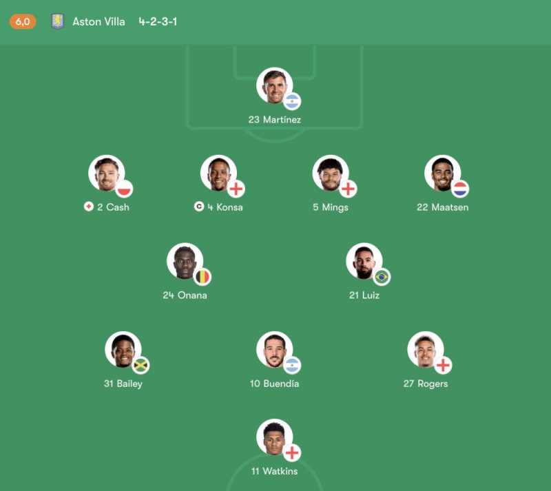 Buendía giữ nhiệm vụ kết nối lối chơi và tìm kiếm khoảng trống giữa các tuyến. Trên hàng công, Watkins tiếp tục là mũi nhọn quan trọng nhờ khả năng di chuyển linh hoạt và tận dụng tốt những cơ hội trong vòng cấm.