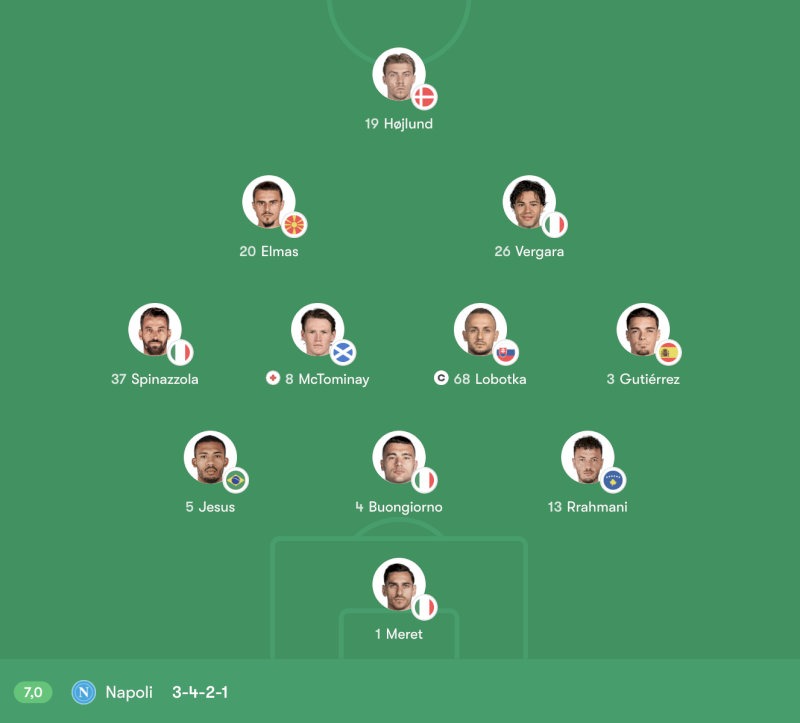 Napoli sử dụng sơ đồ 3-4-2-1 để tối ưu khả năng kiểm soát trung tuyến, dựa trên bộ ba trung vệ có khả năng phân phối bóng tốt. Buongiorno điều phối hàng ngang và là nhân tố then chốt trong các tình huống chống phản công, trong khi Jesus và Rrahmani đảm nhiệm việc che chắn hai biên.