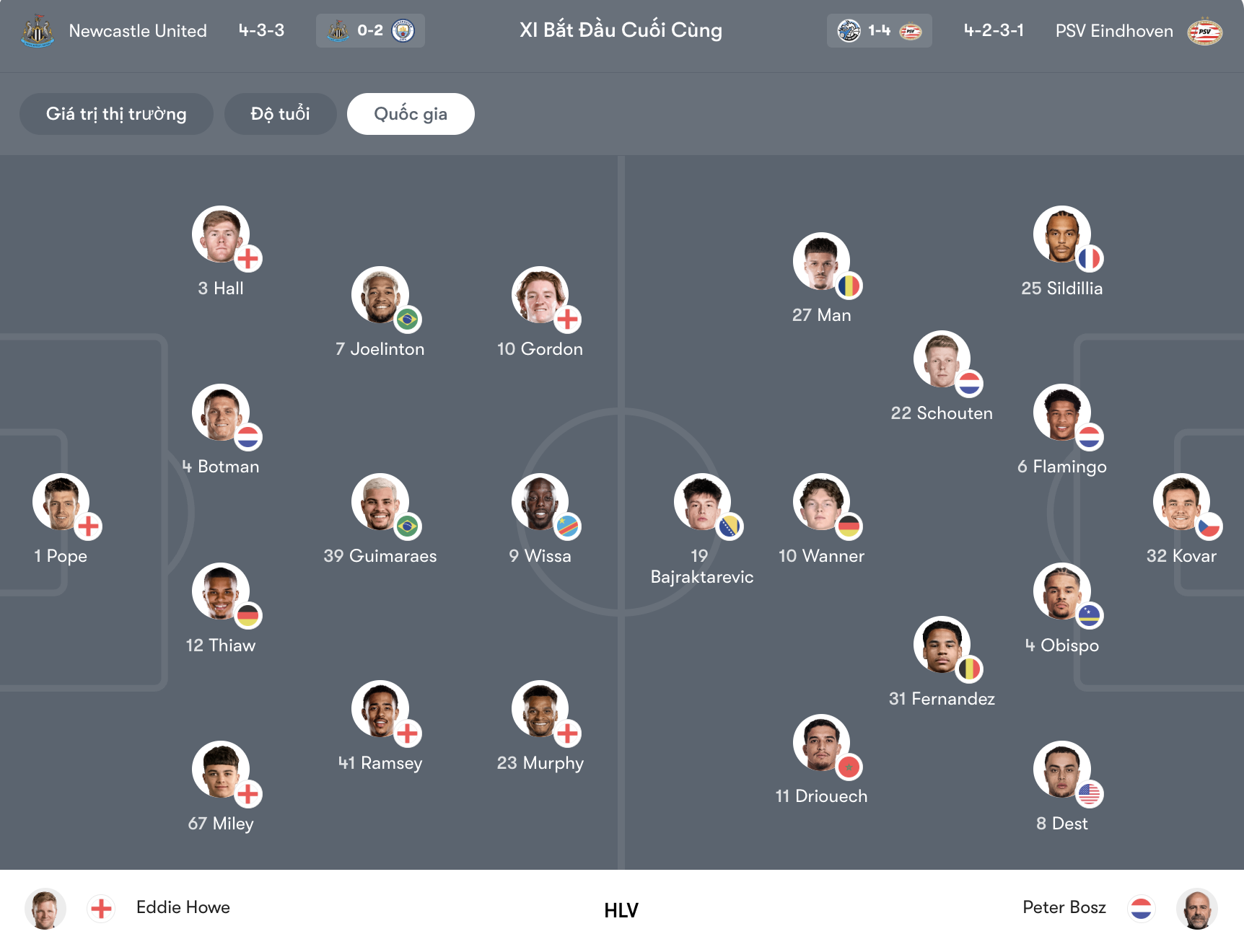 Newcastle nổi bật với cường độ pressing và sức mạnh thể chất, trong đó Guimarães đóng vai trò then chốt trong việc kiểm soát nhịp độ. PSV lại thiên về khả năng giữ bóng và tổ chức, với Schouten và Fernández giúp đội khách duy trì sự ổn định ở trung tuyến.
