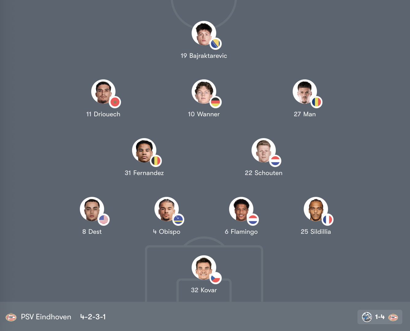 PSV Eindhoven tiếp cận trận đấu với sơ đồ 4-2-3-1, chú trọng kiểm soát bóng và tổ chức tấn công có chiều sâu. Kovář đảm nhiệm vai trò thủ môn với khả năng chơi chân tốt, hỗ trợ triển khai bóng từ tuyến dưới. Hàng thủ gồm Flamingo và Obispo ở trung tâm, ưu tiên giữ cự ly và hạn chế các pha xâm nhập trực diện.