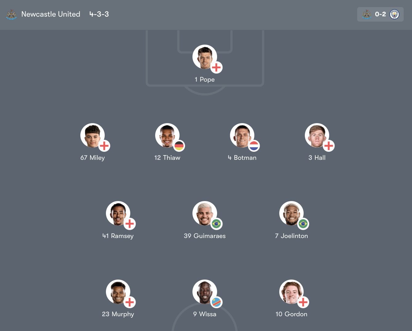 Ở tuyến giữa, Bruno Guimarães là hạt nhân điều phối, giữ vai trò kết nối giữa phòng ngự và tấn công. Joelinton mang lại sức mạnh tranh chấp và khả năng áp sát, còn Ramsey đảm nhiệm vai trò di chuyển linh hoạt, hỗ trợ xâm nhập vòng cấm khi cần thiết. Trên hàng công, Gordon và Murphy hoạt động rộng, tận dụng tốc độ để kéo giãn hàng thủ đối phương. Wissa chơi cao nhất, đóng vai trò trung phong linh hoạt, thường xuyên di chuyển để tạo khoảng trống cho các vệ tinh xung quanh.