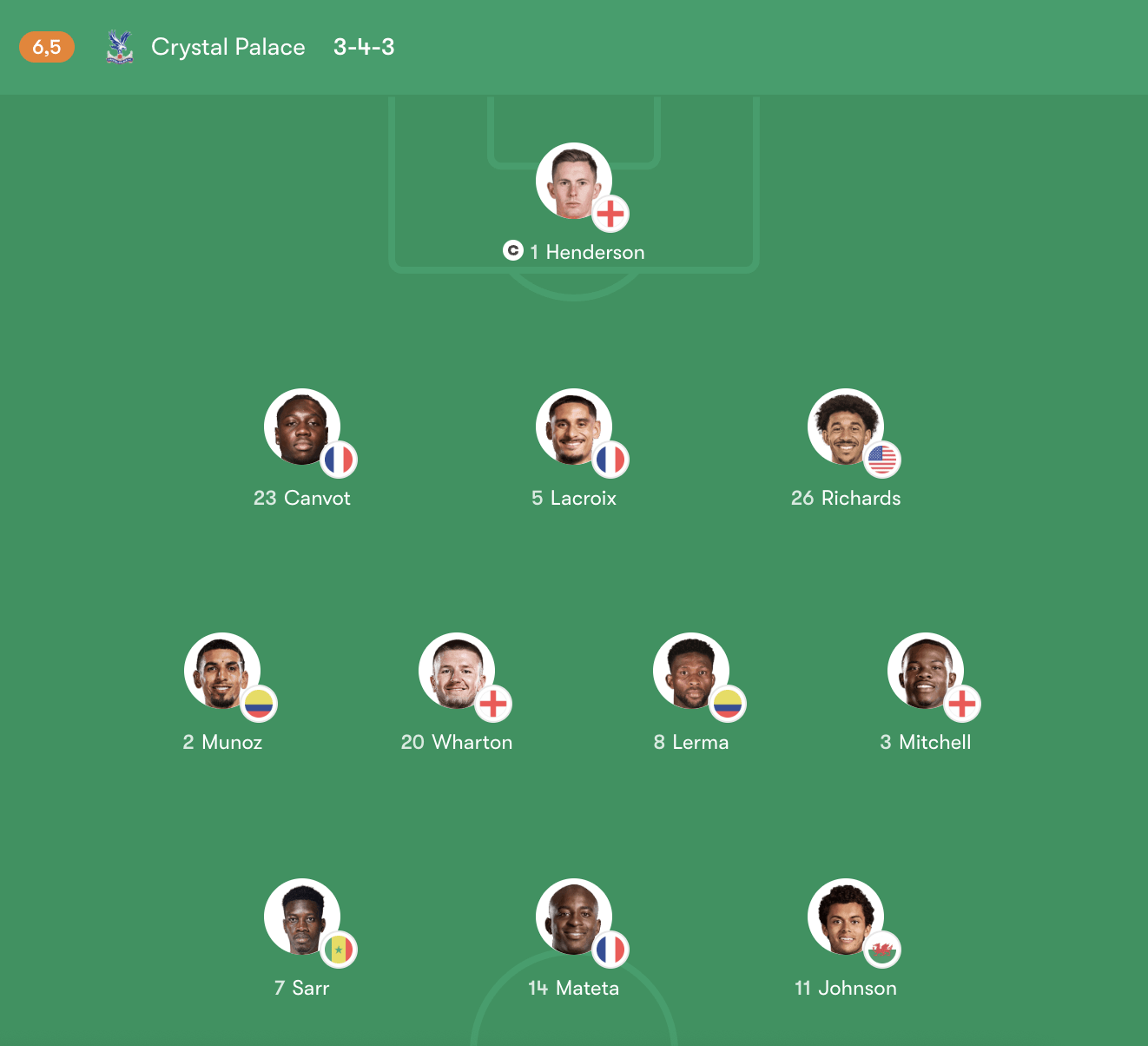 Hàng tiền vệ: Tyrick Mitchell (3) – Jefferson Lerma (8) – Adam Wharton (20) – Daniel Muñoz (2)