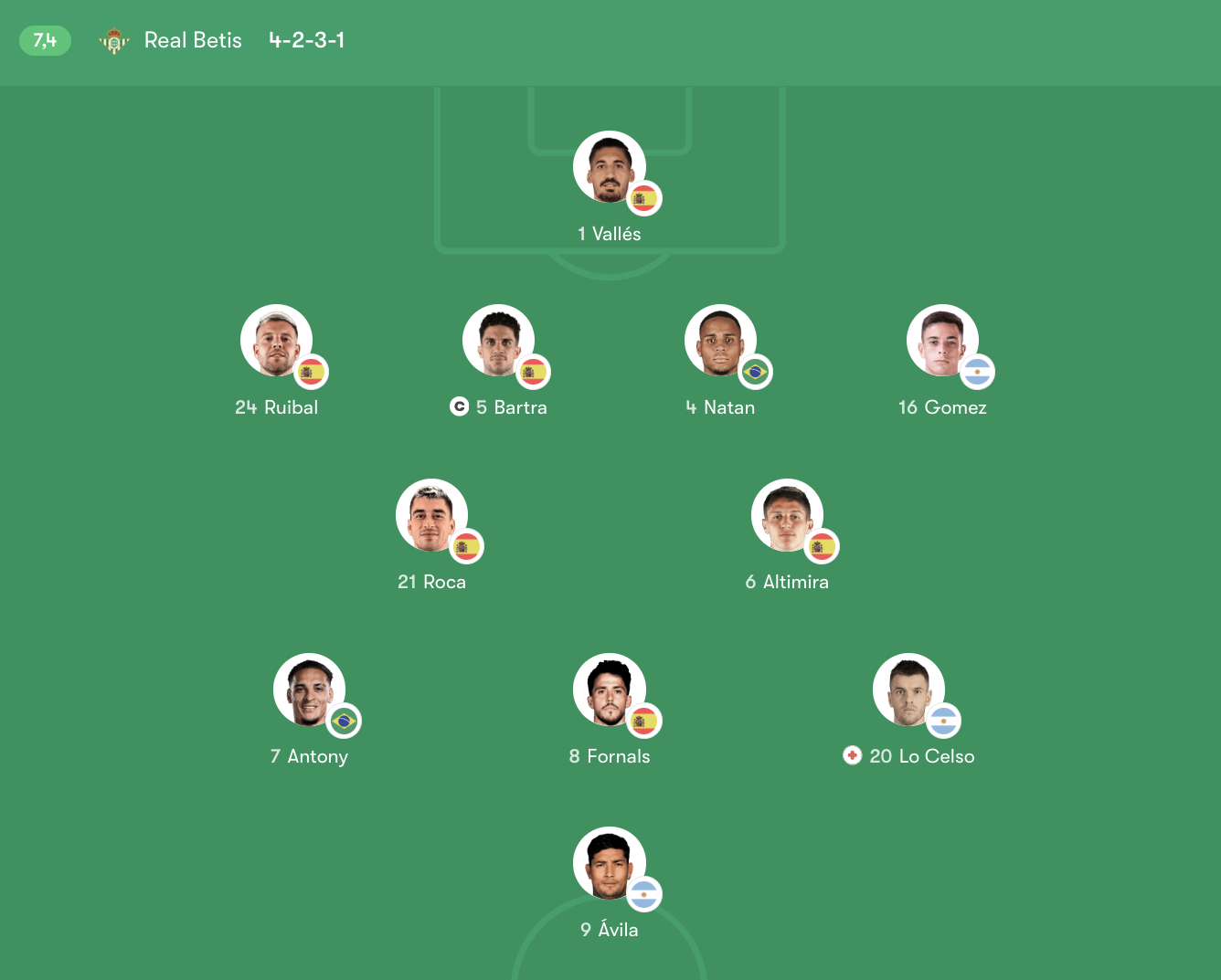 Ở tuyến giữa, Altimira và Marc Roca đảm nhiệm vai trò điều tiết và đánh chặn, giúp đội khách duy trì sự cân bằng giữa phòng ngự và tấn công. Phía trên, Lo Celso là trung tâm sáng tạo, kết nối các mũi tấn công và tạo ra khác biệt bằng những đường chuyền quyết định. Fornals hoạt động linh hoạt giữa các tuyến, trong khi Antony mang đến tốc độ và khả năng đi bóng ở hành lang phải. Trên hàng công, Ávila đóng vai trò trung phong, sẵn sàng gây sức ép lên hàng thủ đối phương và tận dụng cơ hội trong vòng cấm.