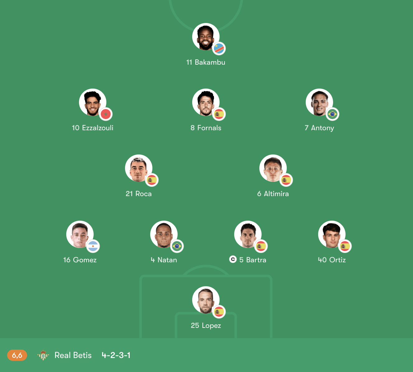 Ở tuyến trên, Fornals giữ vai trò kết nối, thường xuyên di chuyển linh hoạt để mở ra khoảng trống cho hai cánh. Ezzalzouli và Antony mang đến khả năng đột phá và tạo đột biến trong các tình huống 1 đối 1. Trên hàng công, Bakambu là điểm đến chính trong vòng cấm, với nhiệm vụ tận dụng các pha tạt bóng và tình huống bóng.