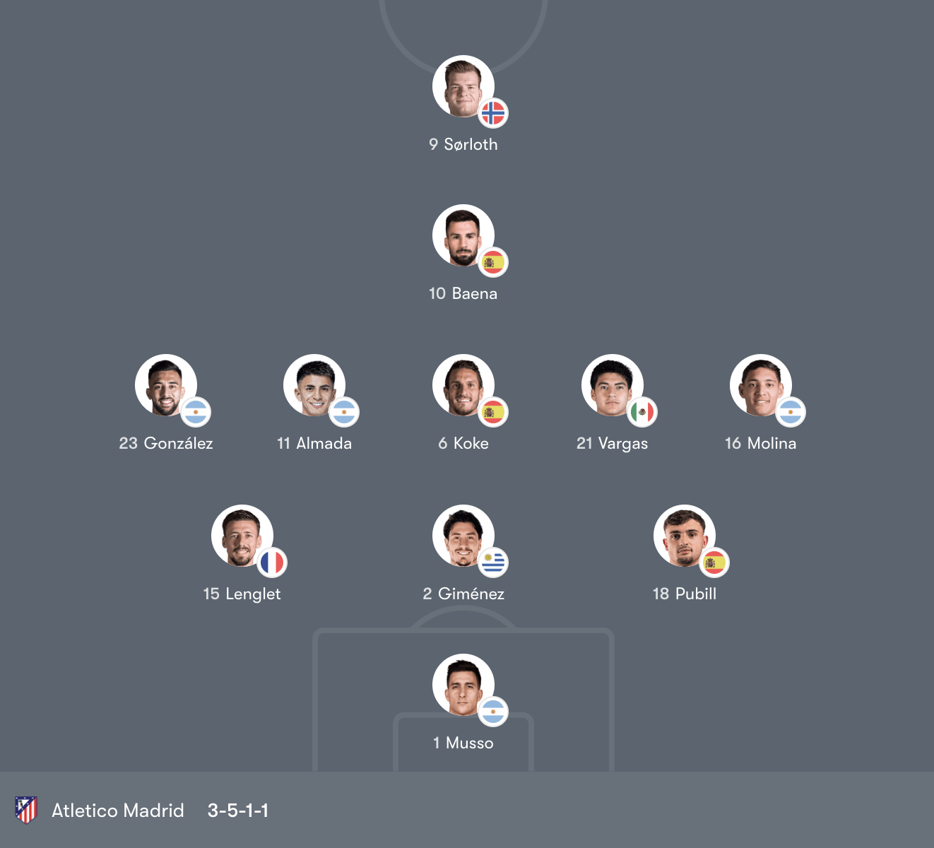 Tiền vệ: González (23) – Almada (11) – Koke (6) – Vargas (21) – Molina (16)