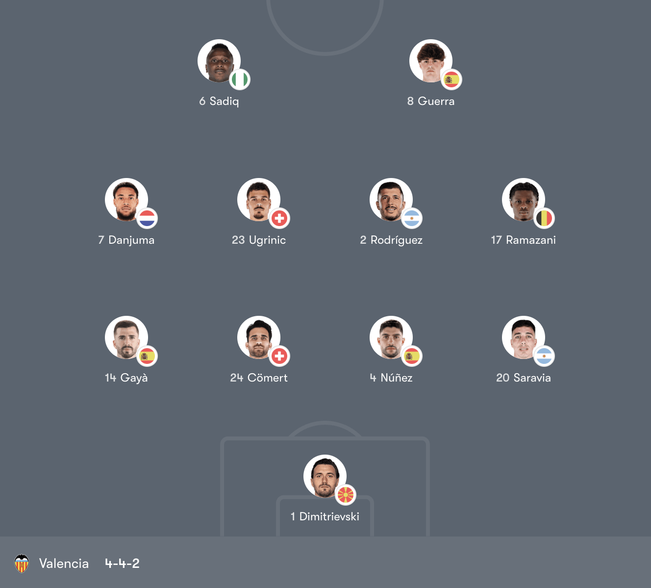 Tuyến giữa của Valencia vận hành theo chiều ngang với sự cơ động của Danjuma và Ramazani ở hai biên. Ugrinic và Rodríguez đóng vai trò điều tiết và hỗ trợ phòng ngự. Trên hàng công, Sadiq và Guerra tạo thành cặp tiền đạo với khả năng phối hợp và dứt điểm đa dạng.