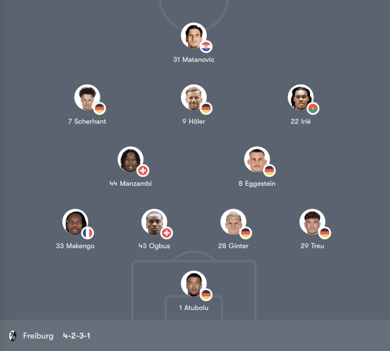 Freiburg duy trì sơ đồ 4-2-3-1 quen thuộc, chú trọng sự cân bằng giữa tấn công và phòng ngự. Trung vệ kỳ cựu Ginter sẽ là điểm tựa nơi hàng thủ, kết hợp cùng Ogbus để tạo nên sự chắc chắn trong các tình huống chống bóng bổng và tranh chấp.