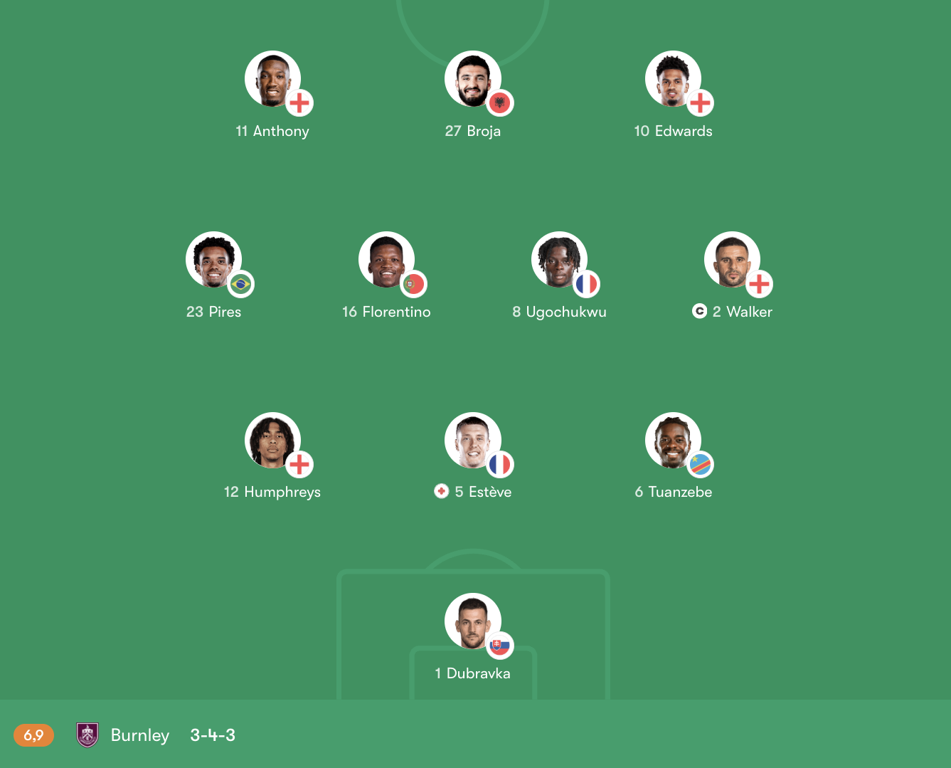 Ở tuyến giữa, Florentino Luís và Ugochukwu đảm nhiệm vai trò đánh chặn, giúp Burnley giữ được cự ly đội hình trước sức ép từ Tottenham. Trên hàng công, Broja đá cao nhất, đóng vai trò làm tường, trong khi Anthony và Marcus Edwards khai thác tốc độ và khả năng đột phá ở hai cánh.