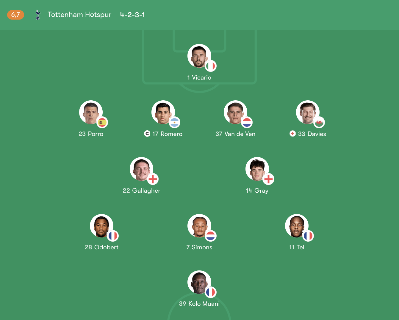 Hậu vệ: Pedro Porro (23) – Cristian Romero (17, Đội trưởng) – Micky van de Ven (37) – Ben Davies (33)