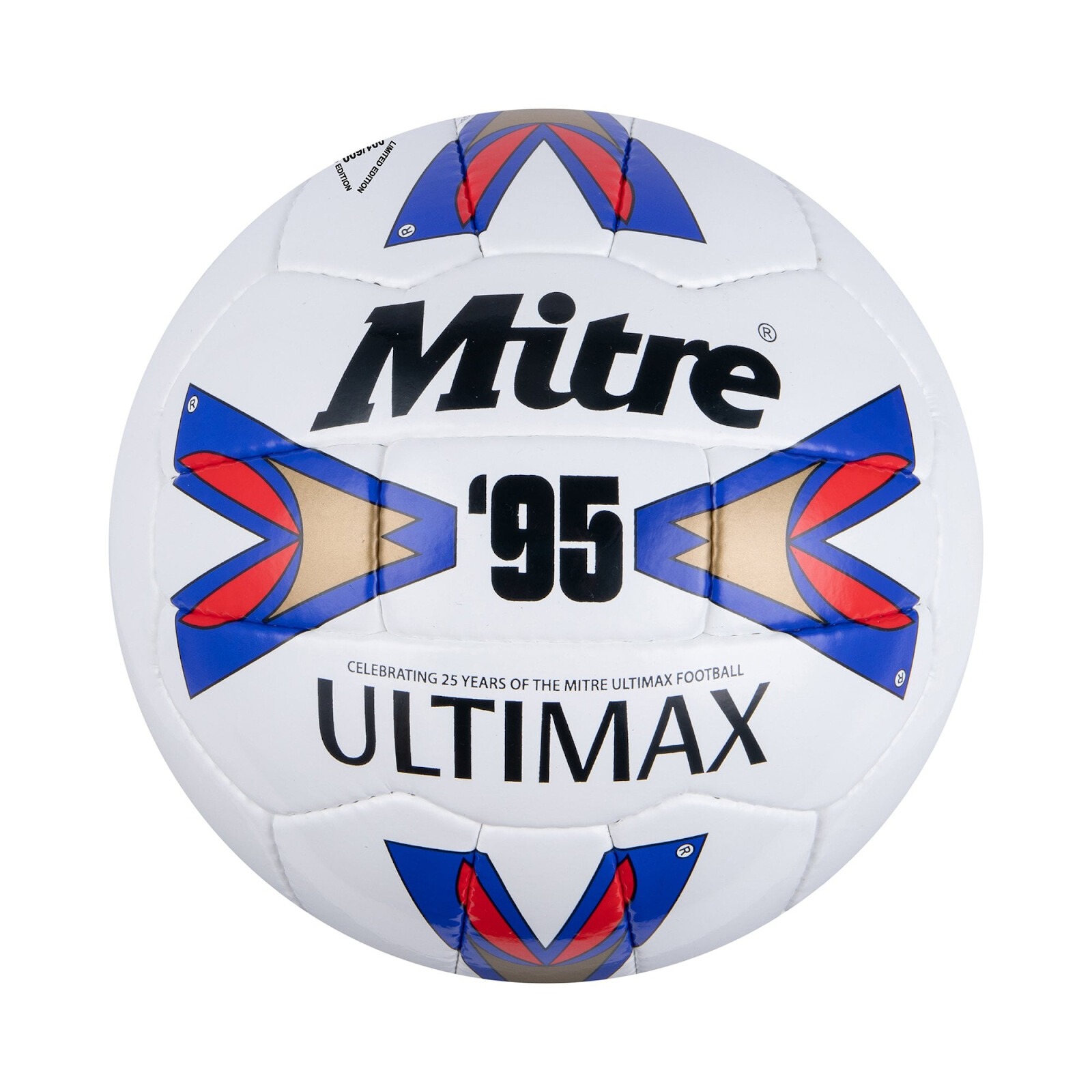 Mitre Ultimax là quả bóng gắn liền với giai đoạn đầu phát triển của Premier League, được sử dụng từ mùa giải 1995 đến 2000. Thiết kế hình học đối xứng, phối màu trắng – xanh đậm đơn giản nhưng cực kỳ đặc trưng. Tên ULTIMAX được in đậm đầy uy lực, trở thành biểu tượng thời kỳ David Beckham, Alan Shearer và Eric Cantona tung hoành.